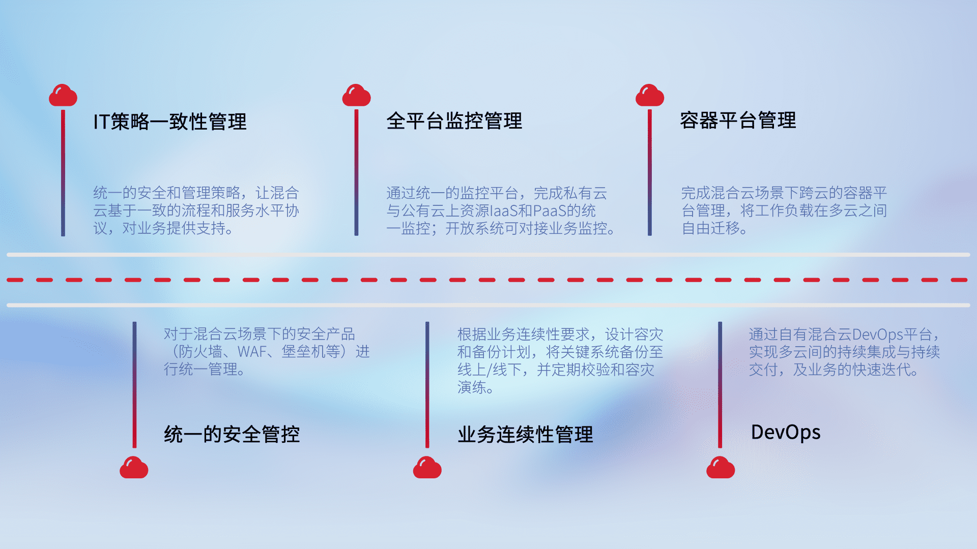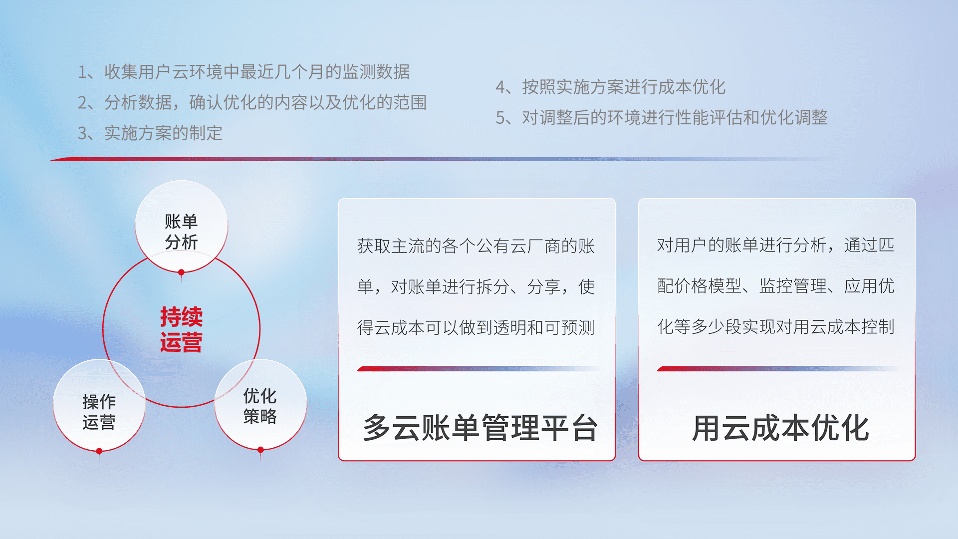 通过多云纳管,,,,以统一的资源数据模型把客户的云资源进行抽象和封装,,进而实现对多云资源的统一操作,,,,保障云资源管理的可靠性、、稳定性与可用性。。量身定制化运维内容,,,配置、、、开发运维、、补丁管理、、备份、、监控、、、、认证和访问管理、、、审计和日常巡检等,,保障在用云过程中的可靠度,,稳定度以及高可用率。。