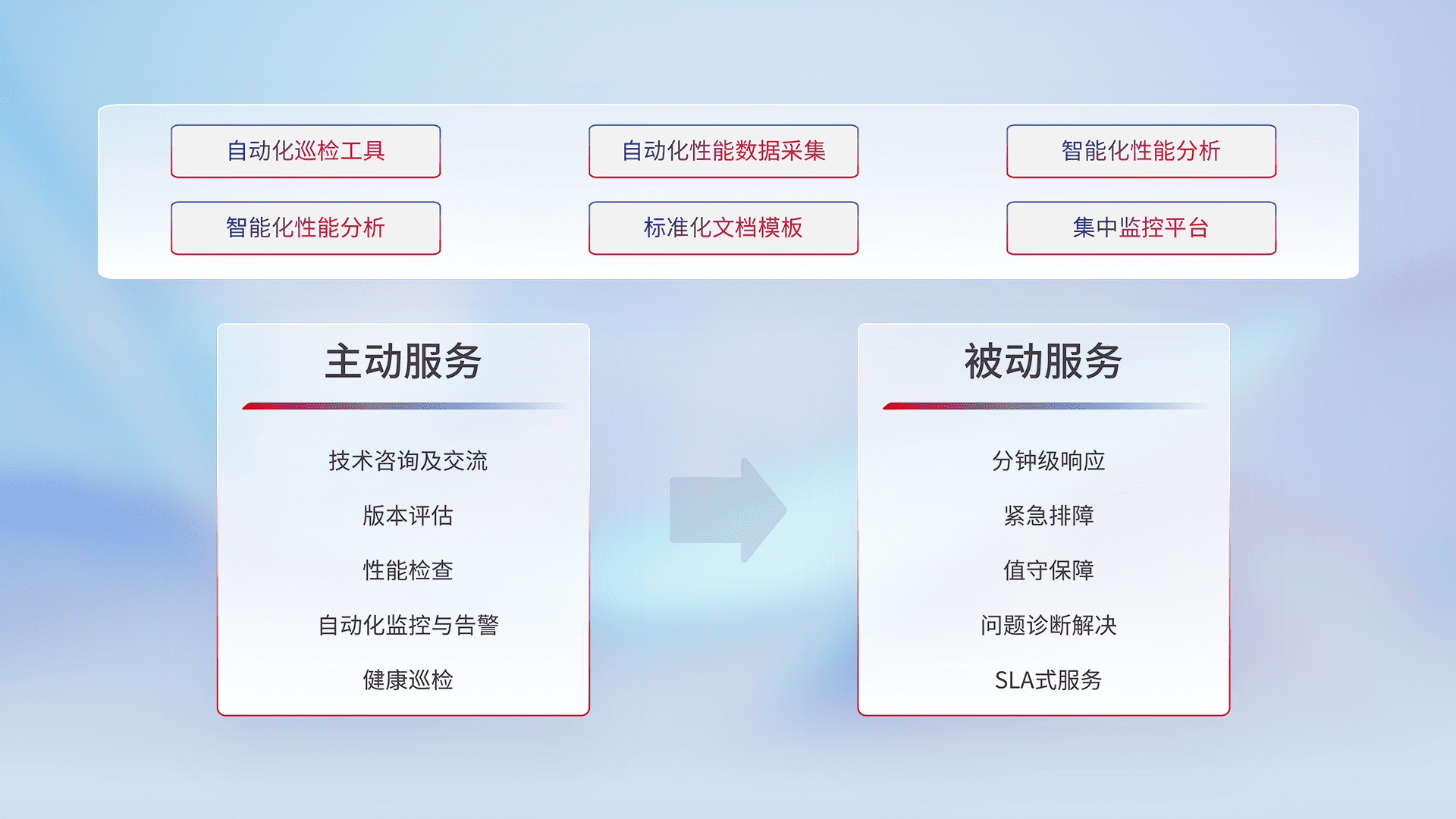 智能化工具和标准化文档,,,,保障服务质量,,,提供主动服务(包含技术咨询、、、、版本评估、、、性能检查、、、自动化监控与告警、、、健康巡检)和被动服务包含(分钟级响应、、、、紧急排障、、、值守保障、、、问题诊断解决、、、SLA服务)。。。